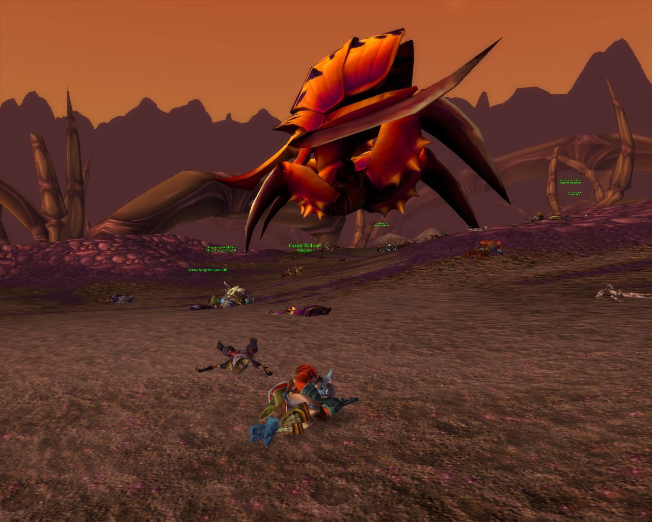 Of course, Mannoroth being a PvP server, you had PvP going on, and it wasn’t fun and friendly. Alliance decided to use their numbers and camp out the 20 man AQ raid instance entrance. Surprisingly, you didn’t have massive ganking/zerging going on elsewhere. I ran up to the outpost in Silithus to pick up the flight point and to repair my armor (I had been killed several times by MOBs at this point and was low on durability). Running into the outpost you see armies of both Horde and Alliance NPCs all lined up. I passed by a group of these before entering the town. After leaving the town and exiting the same way I came in, the army had doubled in size and now a group of Anubis were attempting to attack the NPCs. I decided to steer clear because it looked like an Alliance raid was forming and they didn’t like straggling Horde to interfere with their fighting, even if I was helping.